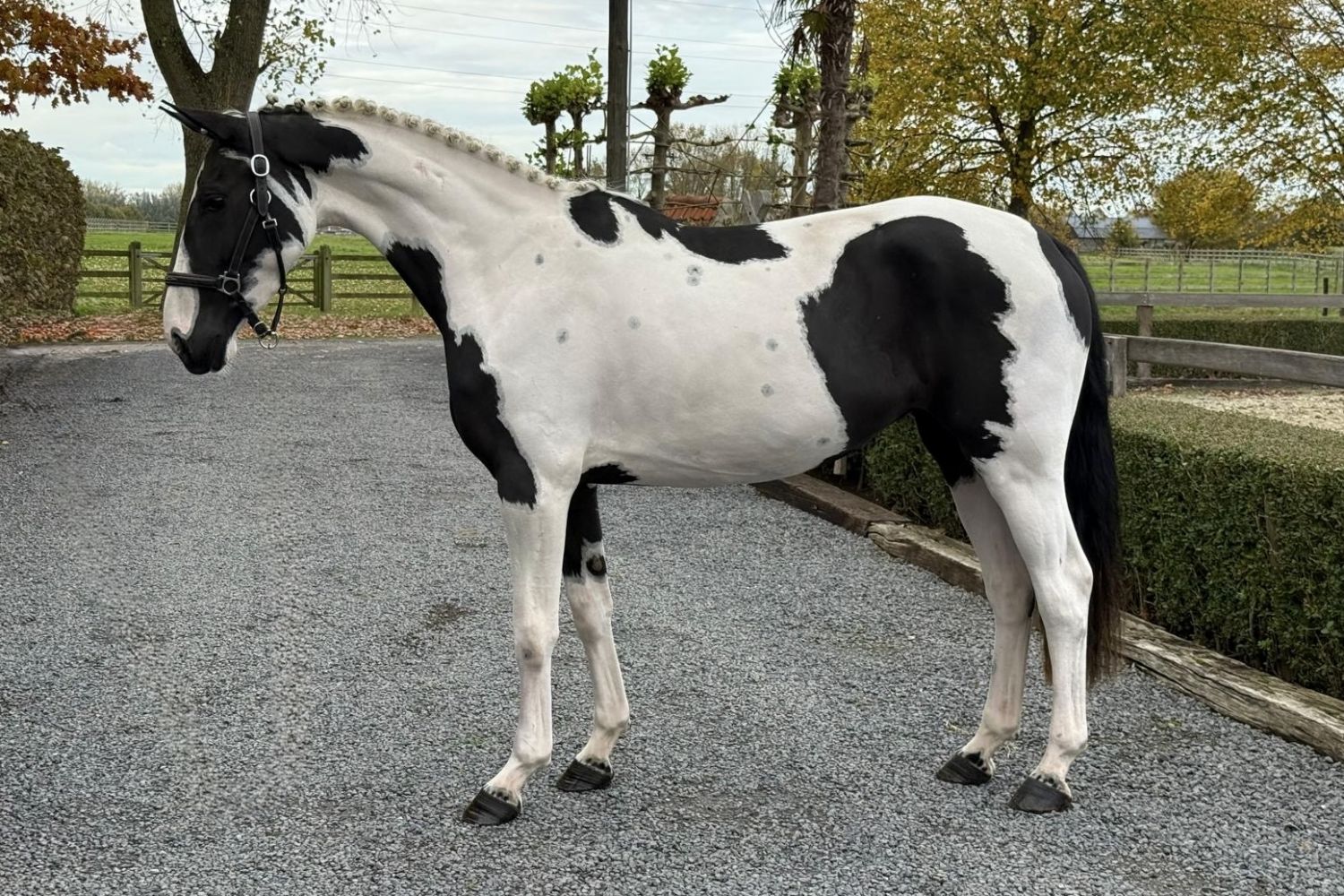 This 3-year-old pinto mare is truly eye-catching, not only because of her striking color but also thanks to her clear talent for jumping. She is bred for performance, sired by a promising young stallion descending from Emerald van ’t Ruytershof, and that quality certainly shows. During free jumping, she makes a strong impression: she shows good technique, intelligence, and carefulness at the fences. This mare combines quality, mindset, and presence in a way that makes her truly special. A beautiful mare with great potential for both sport and breeding!